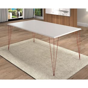 Mesa De Jantar Elen 140x80cm Tampo Branco Com Base CobreA sua cozinha ou sala de jantar só está completa com uma boa mesa para realizar as grandes refeições em família. E se você busca um móvel de qualidade e com combinação de cores, o modelo Elen é para você! De tampo retangular e estrutura em ferro, ela acomoda os seus convidados enquanto deixa o momento mais intimista. Mas não é só a sua rotina que ganha uma bela aliada, ela também complementa a decoração com sofisticação, além de ser harmonizável com cadeiras da mesma cor ou coloridas, seja para garantir um visual monocromático ou voltado para algo arrojado. Ah, a peça não acompanha cadeiras e você deve adquiri-las separadamente para deixar o uso completo.Informações importantes:- Os objetos que ambientam as fotos não acompanham o produto.- Verifique as dimensões do produto e certifique-se que o percurso que ele fará até o local de uso permite sua passagem.- Favor verificar se os pés estão dentro do forro inferior do produto.- Fique atento, nossas cores podem sofrer alterações dependendo do seu monitor.Especificações:Cor: BrancoBase: CobreInstruções/Cuidados:Limpar com Pano Levemente UmedecidoConteúdo da Embalagem 1 Mesa (Cadeiras não acompanham o produto) - Entregue em: 2 VolumesModelo ElenMaterial Estrutura em Ferro; Tampo em MDF 20 mm; Pés Fixos em Ferro; Acabamento em Semi-BrilhoDescrição do Tamanho - Altura: 76 cm - Largura: 140 cm - Profundidade: 80 cmFormato RetangularTipo de pé FixoMesa de Jantar Elen 140x80cm Tampo Branco com Base Cobre