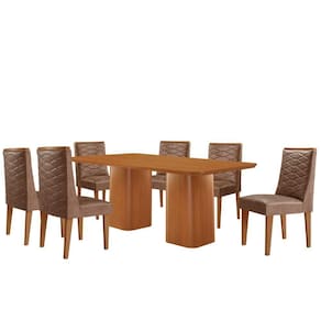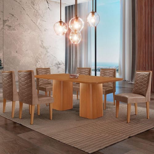 Mesa De Jantar Eloise 180cm Tampo Mdf 6 Cadeiras Moderna Tork/ Conjunto Sala de Jantar Mesa Eloise e Cadeira Safira A Mesa Eloise e uma peca de design sofisticado, com tampo em MDF Canto Copo, que adiciona elegancia e modernidade ao ambiente. Seu grande destaque esta nas bases com formato de torres, que trazem um visual marcante. As Cadeiras Safira sao totalmente estofadas, oferecendo conforto e um toque de charme com seus elegantes bordados na parte frontal e traseira. Os detalhes sofisticados valorizam ainda mais seu visual, tornando-a perfeita para ambientes modernos e elegantes. As alcas facilitam o manuseio, tornando o dia a dia mais pratico ao movimentar as cadeiras.