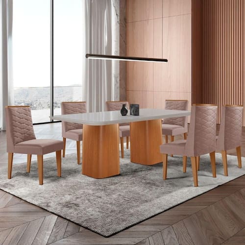 Mesa De Jantar Eloise 180cm Tampo Mdf 6 Cadeiras Moderna Linho Capuccino/nat/off/serig. Off Conjunto Sala de Jantar Mesa Eloise e Cadeira Safira A Mesa Eloise e uma peca de design sofisticado, com tampo em MDF Vidro Canto Copo, que adiciona elegancia e modernidade ao ambiente. Seu grande destaque esta nas bases com formato de torres, que trazem um visual marcante. As Cadeiras Safira sao totalmente estofadas, oferecendo conforto e um toque de charme com seus elegantes bordados na parte frontal e traseira. Os detalhes sofisticados valorizam ainda mais seu visual, tornando-a perfeita para ambientes modernos e elegantes. As alcas facilitam o manuseio, tornando o dia a dia mais pratico ao movimentar as cadeiras.