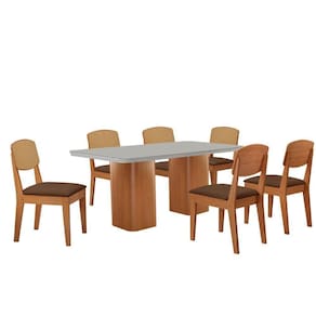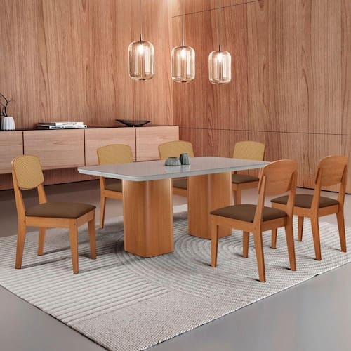 Mesa De Jantar Eloise 180cm Tampo Mdf 6 Cadeiras Moderna Veludo Marrom/nat/off/serig. Off Conjunto Sala de Jantar Mesa Eloise e Cadeira Copper Premium A Mesa Eloise e uma peca de design sofisticado, com tampo em MDF Canto Copo e Vidro, que adiciona elegancia e modernidade ao ambiente. Seu grande destaque esta nas bases com formato de torres, que trazem um visual marcante. A Cadeira Copper Premium combina design contemporaneo e conforto, com encosto em MDF Vidro moldado que proporciona suporte ergonomico ideal. Seu estofado macio garante um assento aconchegante, enquanto o acabamento refinado e os detalhes sofisticados no encosto, que imitam rattan, valorizam seu visual, tornando-a perfeita para ambientes modernos e elegantes.