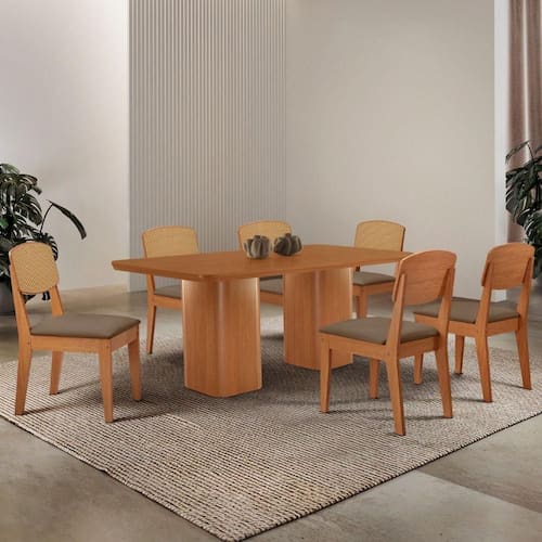 Mesa De Jantar Eloise 180cm Tampo Mdf 6 Cadeiras Moderna Veludo Capuccino/naturalle Conjunto Sala de Jantar Mesa Eloise e Cadeira Copper A Mesa Eloise e uma peca de design sofisticado, com tampo em MDF Canto Copo, que adiciona elegancia e modernidade ao ambiente. Seu grande destaque esta nas bases com formato de torres, que trazem um visual marcante. A Cadeira Copper Premium combina design contemporaneo e conforto, com encosto em MDF moldado que proporciona suporte ergonomico ideal. Seu estofado macio garante um assento aconchegante, enquanto o acabamento refinado e os detalhes sofisticados no encosto, que imitam rattan, valorizam seu visual, tornando-a perfeita para ambientes modernos e elegantes.