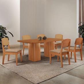 Mesa De Jantar Eloise 180cm Tampo Mdf 6 Cadeiras Moderna Turim 07/ Conjunto Sala de Jantar Mesa Eloise e Cadeira Copper A Mesa Eloise e uma peca de design sofisticado, com tampo em MDF Canto Copo, que adiciona elegancia e modernidade ao ambiente. Seu grande destaque esta nas bases com formato de torres, que trazem um visual marcante. A Cadeira Copper Premium combina design contemporaneo e conforto, com encosto em MDF moldado que proporciona suporte ergonomico ideal. Seu estofado macio garante um assento aconchegante, enquanto o acabamento refinado e os detalhes sofisticados no encosto, que imitam rattan, valorizam seu visual, tornando-a perfeita para ambientes modernos e elegantes.