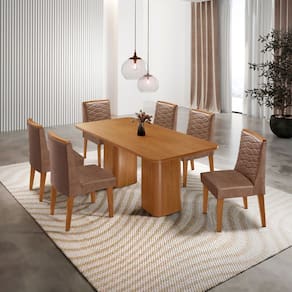 A mesa se adapta com facilidade a qualquer estilo de decoração, enquanto as cadeiras oferecem um toque de luxo e conforto incomparáveis, com assentos e encostos estofados e detalhes bordados.