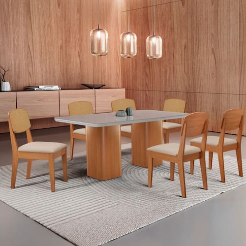 A Mesa Eloise é uma peça de design sofisticado, com tampo em MDF Canto Copo e Vidro, que adiciona elegância e modernidade ao ambiente. Seu grande destaque está nas bases com formato de torres, que trazem um visual marcante. A Cadeira Copper Premium combina design contemporâneo e conforto, com encosto em MDF Vidro moldado que proporciona suporte ergonômico ideal. Seu estofado macio garante um assento aconchegante, enquanto o acabamento refinado e os detalhes sofisticados no encosto, que imitam rattan, valorizam seu visual, tornando-a perfeita para ambientes modernos e elegantes.