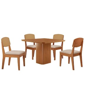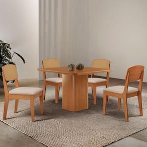Mesa De Jantar Eloise 90cm Tampo Mdf 4 Cadeiras Moderna Veludo Creme/ Conjunto Sala de Jantar Mesa Eloise e Cadeira Copper A Mesa Eloise e uma peca de design sofisticado, com tampo em MDF Canto Copo, que adiciona elegancia e modernidade ao ambiente. Seu grande destaque esta nas bases com formato de torres, que trazem um visual marcante. A Cadeira Copper Premium combina design contemporaneo e conforto, com encosto em MDF moldado que proporciona suporte ergonomico ideal. Seu estofado macio garante um assento aconchegante, enquanto o acabamento refinado e os detalhes sofisticados no encosto, que imitam rattan, valorizam seu visual, tornando-a perfeita para ambientes modernos e elegantes.