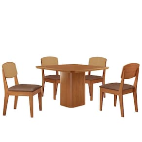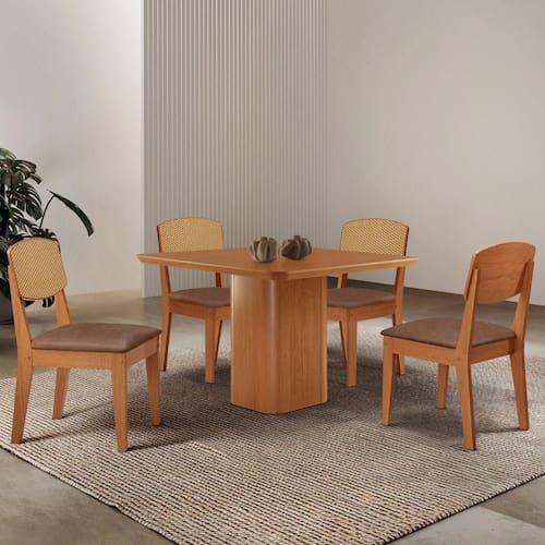 Mesa De Jantar Eloise 90cm Tampo Mdf 4 Cadeiras Moderna Tork/ Conjunto Sala de Jantar Mesa Eloise e Cadeira Copper A Mesa Eloise e uma peca de design sofisticado, com tampo em MDF Canto Copo, que adiciona elegancia e modernidade ao ambiente. Seu grande destaque esta nas bases com formato de torres, que trazem um visual marcante. A Cadeira Copper Premium combina design contemporaneo e conforto, com encosto em MDF moldado que proporciona suporte ergonomico ideal. Seu estofado macio garante um assento aconchegante, enquanto o acabamento refinado e os detalhes sofisticados no encosto, que imitam rattan, valorizam seu visual, tornando-a perfeita para ambientes modernos e elegantes.