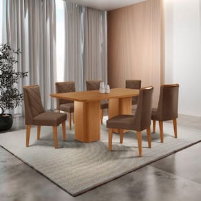 O Conjunto de Mesa Eloise com as Cadeiras Isadora traz sofisticacao e conforto para seu lar. A mesa se destaca pela base, que agrega elegancia ao ambiente, enquanto as Cadeiras Melissa, com assentos e encostos estofados, oferecem conforto excepcional. Os bordados sofisticados e as alcas no encosto adicionam um toque de distincao e charme. Ideal para quem busca combinar estilo e funcionalidade, este conjunto transforma qualquer espaco em um ambiente acolhedor e refinado.