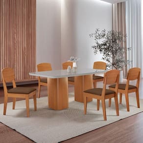 Mesa De Jantar Eloise 180cm Tampo Mdf 6 Cadeiras Moderna Veludo Marrom/nat/off/serig. Off Conjunto Sala de Jantar Mesa Eloise e Cadeira Copper A Mesa Eloise e uma peca de design sofisticado, com tampo em MDF Vidro canto copo, que adiciona elegancia e modernidade ao ambiente. Seu grande destaque esta nas bases com formato de torres, que trazem um visual marcante. A Cadeira Copper combina design contemporaneo e conforto, com encosto em MDF moldado que oferece suporte ergonomico ideal. Seu estofado acolhedor garante um assento confortavel, enquanto o acabamento refinado e detalhes sofisticados valorizam seu visual, tornando-a perfeita para ambientes modernos e elegantes.