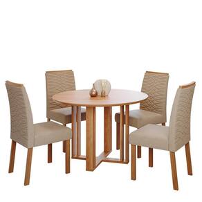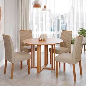 Mesa de Jantar Flora 109cm com Tampo em MDF e 4 Cadeiras Clarice - Cimol Móveis A Mesa de Jantar Flora com Cadeiras Clarice une charme, conforto e funcionalidade para sua sala de jantar. A mesa redonda de 109cm possui estrutura em MDF com pintura UV, tampo de 25mm com cantos arredondados, bordas chanfradas e acabamento em laca, além de base em MDF com formato em cruz e fixação oculta, garantindo mais espaço e um visual limpo. Acompanha 4 cadeiras Clarice Wood com estrutura em madeira Tauari, acabamento em verniz, encosto com detalhe bordado frente e verso, assento com espuma de alta densidade e revestimento em tecido. Cada cadeira suporta até 100kg. Ideal para ambientes sofisticados e acolhedores.