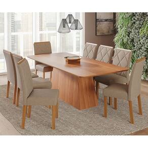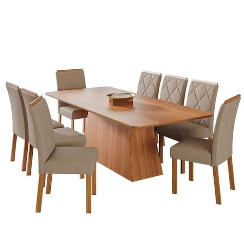 Mesa de Jantar Helena 210x100 com Tampo em MDF e 8 Cadeiras Fernanda Wood - Cimol Móveis O Conjunto Mesa de Jantar Helena 210x100 com 8 Cadeiras Fernanda Wood é a escolha ideal para quem busca sofisticação e conforto. A mesa possui estrutura em MDF, tampo de 25mm com acabamento em laca, cantos arredondados e base triangular com fixação oculta, garantindo um design moderno e elegante. As cadeiras são produzidas em madeira Tauari, com assento e encosto estofados, detalhe bordado e acabamento em verniz, oferecendo beleza e durabilidade. Com capacidade para 8 lugares, é perfeito para reunir família e amigos em grande estilo.