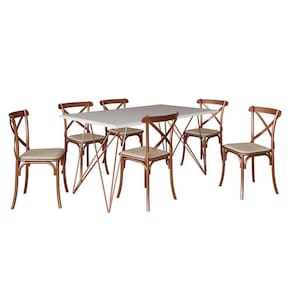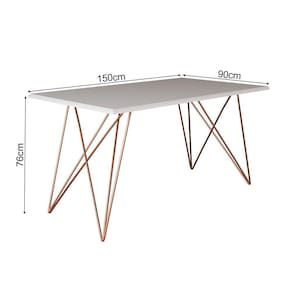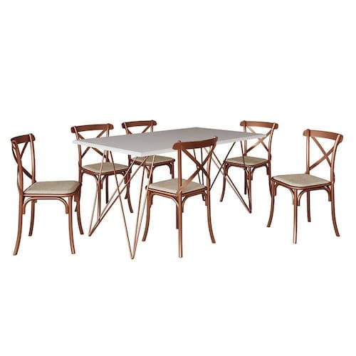 Mesa De Jantar Industrial Com 6 Cadeiras Katrina Cobre Trama Premium Cobre E Branco 150 CmA sua cozinha ou sala de jantar estará completa com esse maravilhoso conjunto para realizar as grandes as refeições e reuniões em família. E se você busca móveis com design contemporâneo, acompanhado de muita qualidade material e combinação de cores clássica, o modelo Trama é para você!Tipo: Conjunto de Mesa e CadeirasModelo: TramaCor Mesa: Cobre e BrancoCor Cadeira: CobreMedidas Mesa:Altura: 76cmLargura: 150cmComprimento: 90cmMedidas Cadeira:Altura: 90cmLargura: 48cmProfundidade: 46cmATENÇÃOIMAGENS MERAMENTE ILUSTRATIVAS REALIZADO EDIÇÃO, PODENDO HAVER UMA PEQUENA VARIAÇÃO DE COR DEPENDENDO DE CADA TELA OU MONITOR.Mesa de Jantar Industrial com 6 Cadeiras Katrina Cobre Trama Premium Cobre e Branco 150 Cm