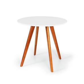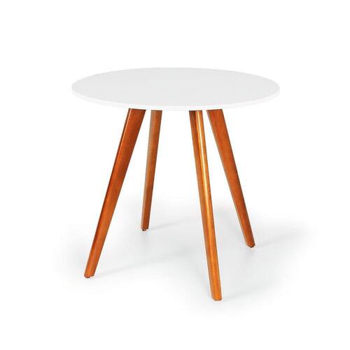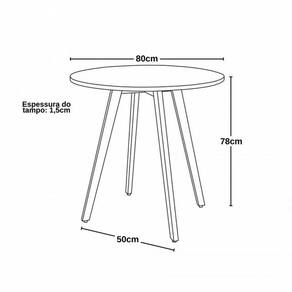Altura da mesa: 78cm Material dos pés: Madeira Tamanho do tampo: 80cm de diâmetro X 1,5cm de espessura. Material do tampo: MDF BP 15mm Acabamento: Melamina fosca Opções de cor: Branco ou preto