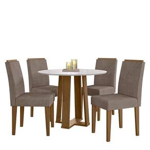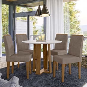 Mesa de Jantar Isabela 100x100 com 4 Cadeiras Amanda - PR Móveis A Mesa de Jantar Isabela possui um design encantador e prático, é ideal para ambientes compactos. Seu formato redondo e seu tamanho reduzido proporcionam a acomodação confortável da sua família e amigos. Já a Cadeira Amanda é elegante, conta com estofamento de alta qualidade que traz um conforto incomparável. Torne suas refeições mais aconchegantes, seja elas diárias ou momentos em família.