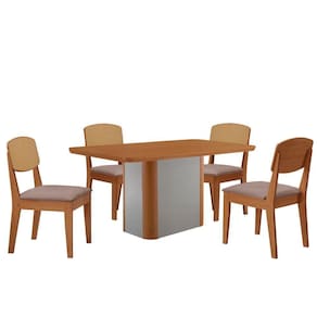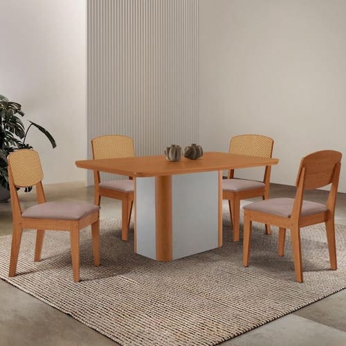 Mesa De Jantar Isadora 120cm Tampo Mdf Laminado Linho Capuccino / /off White Sala de Jantar Isadora com Cadeira Copper Premium A mesa Isadora, com Canto Copo e Vdiro, garante seguranca e durabilidade, enquanto sua base deslumbrante, com detalhe especial na sua angulacao arredondada Naturalle. A Cadeira Copper Premium combina design contemporaneo e conforto, com encosto em MDF moldado que proporciona suporte ergonomico ideal. Seu estofado macio garante um assento aconchegante, enquanto o acabamento refinado e os detalhes sofisticados no encosto, que imitam rattan, valorizam seu visual, tornando-a perfeita para ambientes modernos e elegantes.