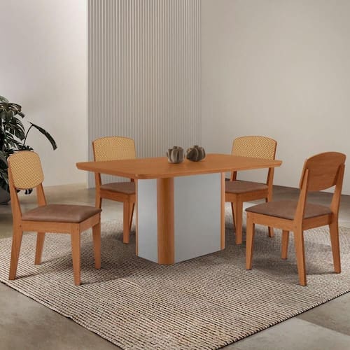 Mesa De Jantar Isadora 120cm Tampo Mdf Laminado Tork / /off White Sala de Jantar Isadora com Cadeira Copper Premium A mesa Isadora, com Canto Copo e Vdiro, garante seguranca e durabilidade, enquanto sua base deslumbrante, com detalhe especial na sua angulacao arredondada Naturalle. A Cadeira Copper Premium combina design contemporaneo e conforto, com encosto em MDF moldado que proporciona suporte ergonomico ideal. Seu estofado macio garante um assento aconchegante, enquanto o acabamento refinado e os detalhes sofisticados no encosto, que imitam rattan, valorizam seu visual, tornando-a perfeita para ambientes modernos e elegantes.