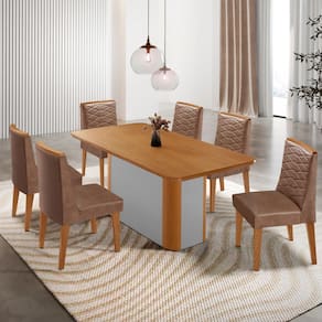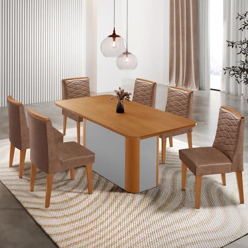 A mesa Isadora, com tampo laminado e canto copo, garante segurança e durabilidade, enquanto sua base deslumbrante, com detalhe especial na sua angulação arredondada Naturalle. As Cadeiras Eloise, totalmente estofadas e com delicados bordados, oferecem o máximo de conforto sem abrir mão do estilo. As alças trazem um visual moderno e diferenciado, complementando o conjunto com sofisticação.