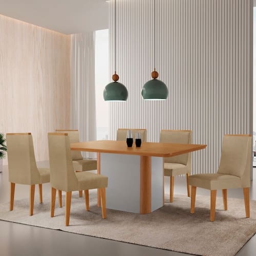 A mesa Isadora, com tampo laminado e canto copo, garante segurança e durabilidade, enquanto sua base deslumbrante, com detalhe especial na sua angulação arredondada Naturalle, transforma este conjunto em uma verdadeira peça de destaque na sua sala de jantar!