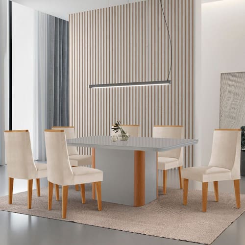 A mesa Isadora, com tampo Canto Copo e Vidro, garante segurança e durabilidade, enquanto sua base deslumbrante, com detalhe especial na sua angulação arredondada Naturalle, transforma este conjunto em uma verdadeira peça de destaque na sua sala de jantar!