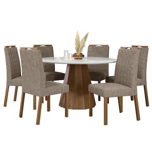 Começou a montar sua cozinha ou sala de jantar? Apresentamos para você esse lindo conjunto fabricado pela New Ceval composto pela mesa de jantar da linha Isis com seis cadeiras da linha Mariana A mesa possui formato redondo e aplicação de vidro em seu tampo dando um toque de elegância. Acomoda confortavelmente 6 pessoas.. As cadeiras do conjunto apresenta os assentos e encostos estofados com espuma D18, proporcionando conforto, sua estrutura resistente produzida em madeira e revestidas de tecidocom toque aveludado.Fabricados com materiais de excelente procedência. Deixe seu ambiente mais receptivo e confortável venha já garantir o seu!