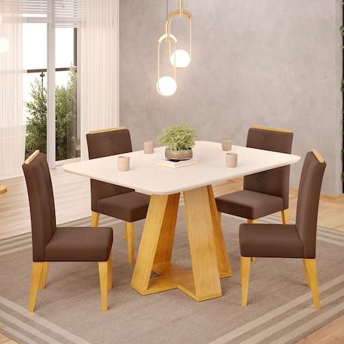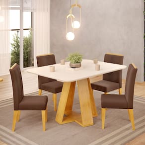 Características: Estrutura em MDP e MDF Acabamento em Pintura UV Formato Retangular Tampo Chanfrado Curvo Vidro Pintado Aplicado no Tampo Sapatas Deslizadoras Peso máximo suportado: 15kg (Mesa) Peso máximo suportado por pessoa: 130kg sem impacto (Cadeira) Assento e encosto com espuma de alta densidade Densidade da espuma: Assento D20 AS e Encosto D13 Estofados com Tecido em Veludo *ACOMPANHA CADEIRAS