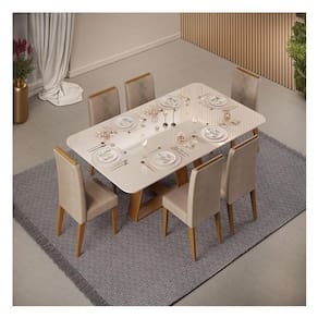 Mesa de Jantar Kiara Freijó Off White com 6 Cadeiras Yasmin Freijó Veludo Kraft - Dj Móveis