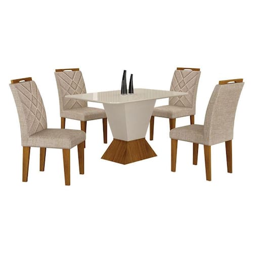 Mesa de Jantar Larissa 120x80 Off White Freijó com 4 Cadeiras MDF Freijó Linho Palha - Leifer Móveis