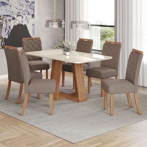 Mesa de Jantar Lins 160cm Canto Arredondado com Vidro Ambiente Nature Off White com 6 Cadeiras Bella Amêndoa - Henn