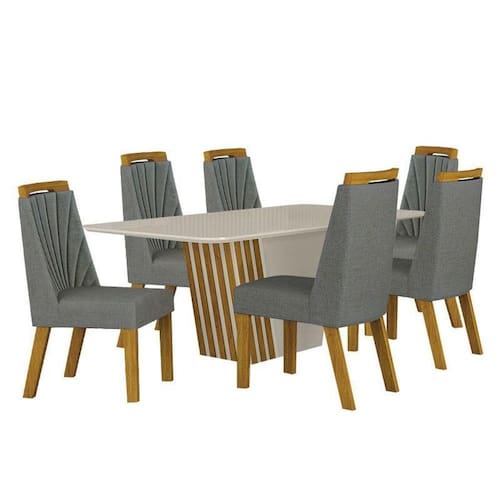 Mesa de Jantar Liz 180x90 Off White Freijó Off com 6 Cadeiras Freijó Linho Cinza Leifer Móveis