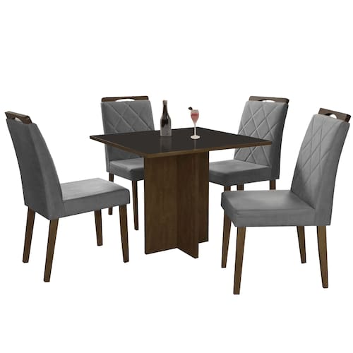 Mesa de Jantar Los Angeles 90x90cm em Linho com 4 Cadeiras Minas Plac Cor Canela Grafite com Tecido Cinza