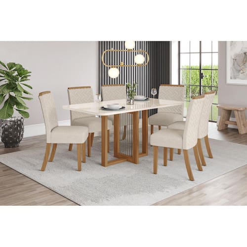 Mesa de Jantar 06 Lugares Natalí 1,600mm Tampo canto arredondado com vidro.   Cadeira Malu:  Densidade da espuma do Assento: D18. Densidade da espuma do Encosto: D15.    Medidas; Mesa: A: 800 x L: 1600 x P: 900 mm Cadeira: A: 980 x L: 440 x P: 600 mm   Grantia: 90 dias.     Recomendação de limpeza: Usa pano levemente umedecido com água, seguido por pano seco. Evitar exposição ao sol, para aumentar a durabilidade da cor do tecido. Não usar escova e/ou produtos abrasivos.    Montagem: Montagem, desmontagem e outras instalações serão de responsabilidade do cliente. Não nos responsabilizamos, no ato da entrega, por subir escadas/elevadores ou pelo transporte por guincho em apartamentos. Eventuais despesas são de responsabilidade do comprador;     Observações importantes: A tonalidade da cor do produto pode variar de acordo com a sua tela, a iluminação do ambiente ou sua percepção visual Lembrando que são fotos ilustrativas tratadas em estúdios podendo haver pequena diferença nas cores A montagem será de responsabilidade do comprador; Não nos responsabilizamos, no ato da entrega, por subir escadas/elevadores ou transporte por guincho em apartamentos. Eventuais despesas são de responsabilidade do comprador; Confira as dimensões deste produto e certifique-se de que passará normalmente por supostos elevadores, portas, escadas e/ou corredores de sua residência; Para mais informações, acesse nossa Central de Atendimento.