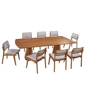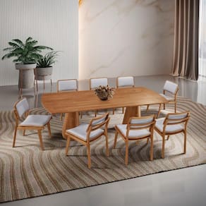 As cadeiras Eva complementam esse conjunto com um toque ainda mais natural. Feitas em madeira macica e cuidadosamente estofadas no assento e encosto, proporcionam o equilibrio perfeito entre conforto e design. Seu formato envolvente acolhe e convida a desfrutar de momentos inesqueciveis ao redor da mesa.