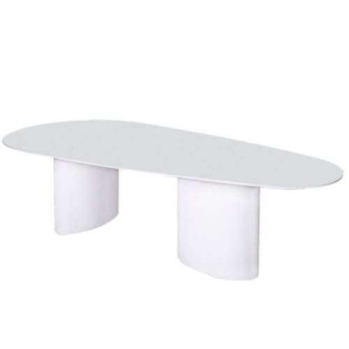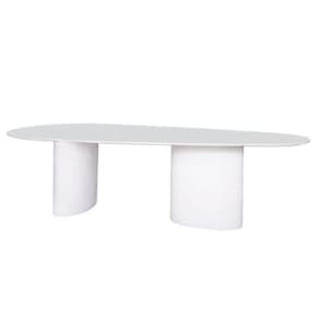 Essa mesa possui duas bases em formato cilindro oval, com acabamento em pintura automotiva PU e acompanha um lindo tampo Laca Branca em formato Orgânico. Muito resistente e ideal para superfícies de apoio como tampo de mesa.