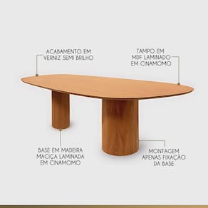 CARACTERÍSTICAS TÉCNICAS: - Bases em Madeira Maciça Laminada em Cinamomo - Tampo em MDF Laminado em Cinamomo - Tampo Chanfrado com 25 mm - Acabamento em Verviz Semi Brilho - Produto Entregue Semi Montado, apenas Fixação da Base