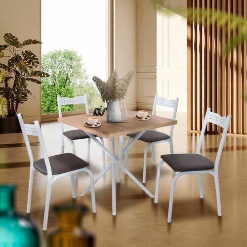 Este conjunto inclui uma mesa e quatro cadeiras, todos com estrutura e pés em aço carbono High-Steel, garantindo resistência e proteção contra ferrugem. As cadeiras possuem assentos de madeira com revestimento em corino sintético e sapatas nos pés para proteger tanto o produto quanto o piso de riscos, suportando até 100 kg cada. A mesa apresenta tampo em MDP BP, ideal para refeições em família ou encontros sociais.
