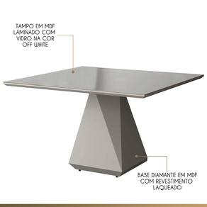 CARACTERÍSTICAS TÉCNICAS: - Base Diamante Produzida em MDF com Revestimento Laqueado - Tampo Produzido em MDF Laminado com Vidro 4mm na Cor Off White - Tampo com Detalhe Chanfrado - Produto Entregue Semi Montado