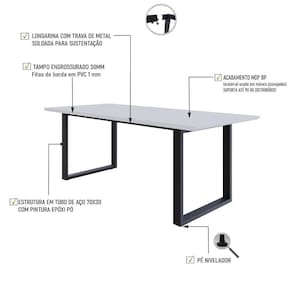 Sobre o ProdutoMesa de Jantar Queens RG2 200x90x77cm QEMJ9200RG2 çoDescrição do Produto:A mesa de jantar Queens QEMJ9200RG2 é a expressão perfeita da fusão entre elegância e robustez, ideal para ambientes modernos e contemporâneos. Com dimensões de 2,00x0,90m, esta peça impressiona pela sua presença marcante. O tampo engrossurado de 30mm com bordas em 45, finalizado com fitas de PVC de 01mm, oferece uma superfície resistente e de excelente acabamento. A estrutura em tubos de aço 70x30mm, complementada por longarinas produzidas com tubos 30x50mm, garante estabilidade e durabilidade, enquanto o design minimalista proporciona um toque moderno e sofisticado a qualquer espaç linha City_Scape captura a sofisticação e o estilo das grandes metrópoles, trazendo móveis inspirados em bairros e cidades icônicas. Com design moderno e cosmopolita, cada peça reflete a elegância urbana, conectando ambientes contemporâneos à atmosfera vibrante das cidades ao redor do mundo. Os tampos engrossurados em MDP BP recobertos com fitas de borda em PVC de 01mm, garantem resistência e durabilidade com um acabamento refinado. As estruturas em aço com soldas a laser e suavizadas, possuem acabamento em pintura epóxi que confere solidez e um visual moderno, garantindo a longevidade e a robustez das peç Inclusos:1 Mesa de JantarDimensões dos Produtos:Mesa de Jantar Queens RG2 200x90x77cm QEMJ9200RG2 ço: 200 x 90 x 77 cmInformações Logísticas (Comp. X Prof. X Alt.) 208 x 103,5 x 6 cm - Peso: 28,24 74 x 77 x 18 cm - Peso: 7,64 KgPeso Total: 35,88 KgObservações:Não acompanha acessórios decorativos. Imagens meramente ilustrativas.Informações Técnicas / Características:- Cor do Produto: ço- Cor do Predominante: Revestido- Marca: Metalig- Modelo: QEMJ9200RG2- Linha: City_Scape- Material: Mdp- Material da Estrutura / Pés: Aço- Acabamento: BP- Escala de Brilho: Fosco- Fita de Borda: Pvc - Possui Gavetas: Não - Possui Pés: 2- Pés Niveladores: Sim - Acabamento Estrutura: Epóxi-Pó- Formato: Retangular -Observações: Possui 02 Lomgarinas horizontais de aço.- Suporta Até (kg): 100kg- Comprimento: 200cm- Profundidade: 90cm- Altura: 77cm - Peso Lí.: 33,68Kg- Recomendações de Uso, Manutenção e Limpeza: Para a limpeza, utilize flanela seca ou pano macio levemente umedecido em água. Utilize um pano seco em seguida. Evite com produtos químicos (solventes, thinner, acetona, etc) e não utilize nenhum tipo de esponja de aço.- Necessita de Montagem: Sim / Acompanha Manual de Montagem- Complexidade da Montagem: Média: pode ser montado por mais de uma pessoa e/ou necessite de maior conhecimento para montagem.- Garantia: 01 ano Comprimento: 200 cm | Altura: 77 cm | Marca: Compace | Largura: 90 cm | Modelo: QEMJ9200RG2 | Quantidade máxima de pedido: 1 | Necessita montagem: Sim | Quantidade de volumes: 2 | Profundidade: 90 cm | Produto: Mesa de Jantar | Cômodo indicado: Cozinhas | Cor: Multicolorido | Material da Estrutura: Aço | Tonalidade: Multicolorido | Industrial: Requer Baterias | Não: Certificação Externa | Manual de montagem e kit acessórios: | Sim: Preço de tabela | 1004: Fabricante | Compace: do Modelo | QEMJ9200RG2: de Caixas | 1: da Peça Cor: Branco TX/