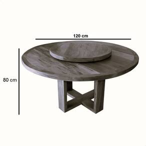 Mesa de jantar redonda 120 cm de diâmetro, com prato giratório de 80 cm, fabricada em madeira maciça de lei com acabamento natural envernizado, garantindo resistência, durabilidade e requinte para seu ambiente. Ideal para reunir família e amigos com praticidade e estilo. Altura 80 cm, peso 90 kg. Montagem simples dos pés.