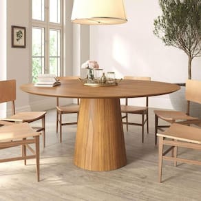 A Mesa de Jantar Redonda Scandi é a escolha perfeita para aqueles que buscam elegância e estilo em sua sala de jantar. O tampo tem sua estrutura em sarrafeado de madeira e lâmina natural de madeira Cinamomo. A madeira Cinamomo é conhecida por sua graciosidade e textura única, que acrescentam um toque de autenticidade e luxo ao seu espaço. Sua base cilíndrica é um exemplo de design contemporâneo, proporcionando estabilidade e elegância. Sua simplicidade minimalista torna-a versátil o suficiente para se adequar a uma variedade de estilos de decoração. Com um diâmetro de 160cm, esta mesa acomoda confortavelmente 8 lugares, tornando-a ideal para reuniões familiares e jantares com amigos.