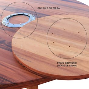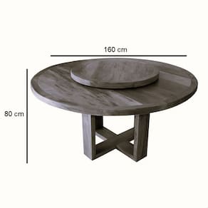 Mesa de jantar redonda 160 cm de diâmetro, com prato giratório de 80 cm, fabricada em madeira maciça de lei com acabamento natural envernizado, garantindo resistência, durabilidade e requinte para seu ambiente. Ideal para reunir família e amigos com praticidade e estilo. Altura 80 cm, peso 90 kg. Montagem simples dos pés.