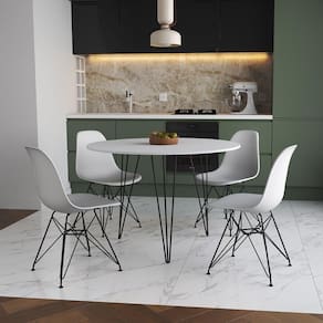 A Mesa de Jantar Redonda Clips com as Cadeiras Eiffel é a escolha perfeita para você que está em busca de um produto sofisticado e muito versátil! O Conjunto possui o diferencial de ser um produto compacto e prático, podendo ser incorporado facilmente nos mais diversos ambientes, como: cozinhas, restaurantes, varandas ou até áreas de festas!CaracterísticasTipo: Conjunto Mesa e 4 CadeirasModelo: ClipsCor do Tampo: BrancoCor do Assento: BrancoBase Ferro: PretoDIMENSÕES DO PRODUTOCadeira:Altura: 85cmLargura: 47cmComprimento: 50cmMesa:Altura: 85cmDiâmetro: 90cmATENÇÃOAS IMAGENS SÃO MERAMENTE ILUSTRATIVAS E PODEM SOFRER VARIAÇÕES DE COR E PEQUENOS DETALHES DE ACORDO COM O SEU MONITOR, ILUMINAÇÃO DO AMBIENTE E ATÉ MESMO A SUA PERCEPÇÃO VISUAL.Mesa de Jantar Redonda 90cm Branca Clips 3 PÃs com 4 Cadeiras Eames Eiffel Brancas Ferro Preto