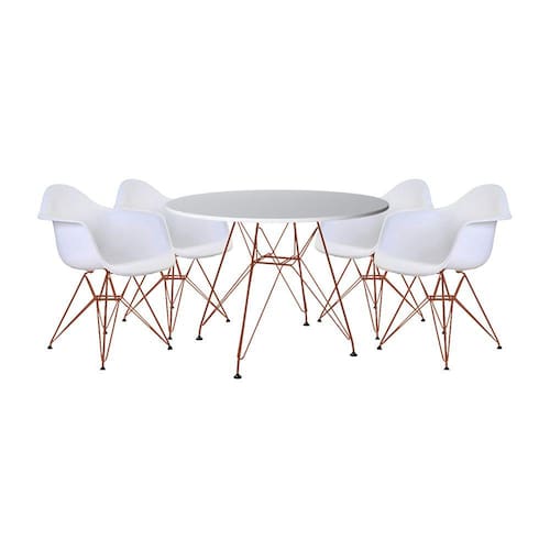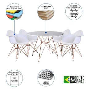 Mesa De Jantar Redonda Eames Eiffel 90cm Branca Com 4 Poltronas Brancas Ferro CobreO Conjunto de Mesa Eames Eiffel e Poltrona Daw se destaca pelo design moderno e sofisticado. Com base em ferro que confere total resistência, garantindo melhor durabilidade, sendo uma ótima escolha para quem busca conforto e design único.Tipo: ConjuntoModelo: DawCor do Tampo: BrancoCor do Assento: BrancoCARACTERÍSTICASAssento: PolipropilenoTampo: BrancoBase: FerroGarantia: 90 DiasDIMENSÕES DA POLTRONAAltura: 80cmAssento até o chão: 40cmBraço do assento até o chão: 65cmLargura: 38cmComprimento: 38cmSuporta até: 120kgDIMENSÕES DA MESAAltura: 76cmDiâmetro: 90cmRECOMENDAÇÕESLimpeza: Utilize um pano macio levemente úmido.Necessita montagem.ATENÇÃOAS IMAGENS SÃO MERAMENTE ILUSTRATIVAS E PODEM SOFRER VARIAÇÕES DE COR E PEQUENOS DETALHES DE ACORDO COM O SEU MONITOR, ILUMINAÇÃO DO AMBIENTE E ATÉ MESMO A SUA PERCEPÇÃO VISUAL.