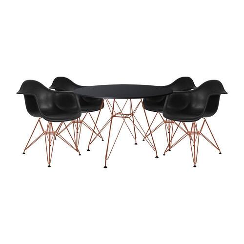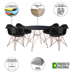 Mesa De Jantar Redonda Eames Eiffel Preta 110cm Com 4 Poltronas Pretas Ferro CobreO Conjunto de Mesa Eames Eiffel e Poltrona Daw se destaca pelo design moderno e sofisticado. Com base em ferro que confere total resistência, garantindo melhor durabilidade, sendo uma ótima escolha para quem busca conforto e design único.Tipo: ConjuntoModelo: DawCor do Tampo: PretoCor do Assento: PretoCARACTERÍSTICASAssento: PolipropilenoTampo: PretoBase: FerroGarantia: 90 DiasDIMENSÕES DA POLTRONAAltura: 80cmAssento até o chão: 40cmBraço do assento até o chão: 65cmLargura: 38cmComprimento: 38cmSuporta até: 120kgDIMENSÕES DA MESAAltura: 76cmDiâmetro: 110cmRECOMENDAÇÕESLimpeza: Utilize um pano macio levemente úmido.Necessita montagem.ATENÇÃOAS IMAGENS SÃO MERAMENTE ILUSTRATIVAS E PODEM SOFRER VARIAÇÕES DE COR E PEQUENOS DETALHES DE ACORDO COM O SEU MONITOR, ILUMINAÇÃO DO AMBIENTE E ATÉ MESMO A SUA PERCEPÇÃO VISUAL.