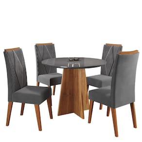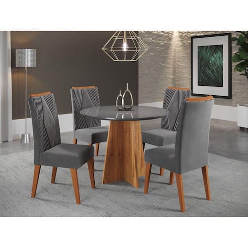 Mesas são indispensáveis para o funcionamento da casa e é no cômodo de confraternização que elas ganham protagonismo. Composto por peças de muito charme, o Conjunto RIU com cadeira Vegas torna o uso desse móvel importante para garantir uma usabilidade plena para o seu dia a dia. Ideal para cozinhas e salas de jantar. Medida da Mesa (A x L x P): A:78 x L:90 x P:90cm Peso da Mesa: 29,8 kg Mesa suporta até: 50.0000 Acabamento da Cadeira/Banco: Pintura UV Acabamento da Mesa: Pintura UV Acompanha Manual de Instalação: Sim Ambiente Principal: Sala de Jantar Cadeira/Banco Estofada: Encosto e Assento Estofados Cadeira/Banco estofada: Encosto e Assento Estofados Cadeira/Banco suporta até: 90.0000 codigo_ean: 7909903491621 Complexidade da Montagem: Média: pode ser montado por mais de uma pessoa e/ou necessite de maior conhecimento para montagem Cor: Mel/Grafite Cor do Produto: Mel/Grafite De Canto (Canto Alemão): Não Enchimento do Assento: Espuma D-20 Enchimento do Encosto: Espuma D-12 Escala de Brilho: Semi-Brilho Espessura do Tampo: 25 mm Informações Complementares: Sala de Jantar 4 lugares Itens Inclusos: 1 Mesa, 4 Cadeiras, Kit Ferragem, Manual de Montagem Manual de Montagem e Instalação: https://product-hub-prd.madeiramadeira.com.br/880359/documents/16aeb5fe-70e9-479c-a0ff-2052746348a3montagemsalariucomcadvegas.pdf Material da Base da Mesa: MDP Material da Estrutura da Cadeira: MDF/Madeira Maciça Material do Tampo: Vidro/MDF Material Principal: MDF/MDP Material Principal das Cadeiras/Bancos: Madeira Maciça Medida da Cadeira/Banco (A x L x P): A:101 x L:41 x P:61cm Medida do Tampo (L x C x E): L:90 x P:90 x E:2,5cm Mesa Extensível: Não Necessita Montagem: Sim Origem do Produto: Nacional Peso da Cadeira/Banco: 7,25 kg Possui Apoio Para os Pés: Não Possui Vidro: Sim Quantidade de Cadeiras: 4 Quantidade de Lugares: 04 Recomendações de Uso, Manutenção e Limpeza: Limpar com pano levemente umedecido com água Revestimento da Cadeira/Banco: Veludo Sistema de Montagem: Parafusos, cavilhas Vidro Temperado: Sim