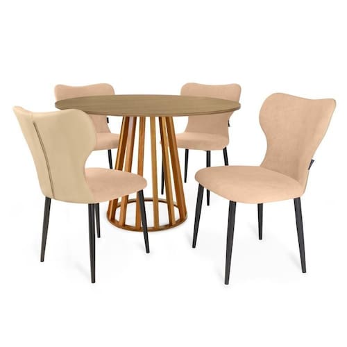 Conjunto Mesa de Jantar Redonda Talia Amadeirada com 4 Cadeiras Estofada Jacobsen