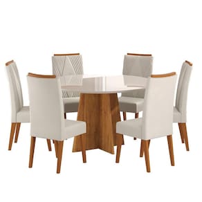 Mesas são indispensáveis para o funcionamento da casa e é no cômodo de confraternização que elas ganham protagonismo. Composto por peças de muito charme, o Conjunto VITARA com cadeira Vegas torna o uso desse móvel importante para garantir uma usabilidade plena para o seu dia a dia. Ideal para cozinhas e salas de jantar. Medida da Mesa (A x L x P): A:78 x L:135 x P:135cm Peso da Mesa: 59,7 kg Mesa suporta até: 50.0000 Acabamento da Cadeira/Banco: Pintura UV Acabamento da Mesa: Pintura UV Acompanha Manual de Instalação: Sim Ambiente Principal: Sala de Jantar Cadeira/Banco estofada: Encosto e Assento Estofados Cadeira/Banco Estofada: Encosto e Assento Estofados Cadeira/Banco suporta até: 90.0000 codigo_ean: 7909903488553 Complexidade da Montagem: Média: pode ser montado por mais de uma pessoa e/ou necessite de maior conhecimento para montagem Cor: Mel/Marfim/Off White Cor do Produto: Mel/Marfim/Off White De Canto (Canto Alemão): Não Enchimento do Assento: Espuma D-20 Enchimento do Encosto: Espuma D-12 Escala de Brilho: Semi-Brilho Espessura do Tampo: 25 mm Formato do Tampo: Redondo Informações Complementares: Sala de Jantar 6 lugares Itens Inclusos: 1 Mesa, 6 Cadeiras, Kit Ferragem, Manual de Montagem Manual de Montagem e Instalação: https://product-hub-prd.madeiramadeira.com.br/880184/documents/7615f17f-df62-44f7-b2d9-5bb5d26d36b3montagemsalavitaracomvegas.pdf Material da Base da Mesa: MDP Material da Estrutura da Cadeira: MDF/Madeira Maciça Material do Tampo: Vidro/MDF Material Principal: MDF/MDP Material Principal das Cadeiras/Bancos: Madeira Maciça Medida da Cadeira/Banco (A x L x P): A:101 x L:41 x P:61cm Medida do Tampo (L x C x E): L: 135 x P:135 x E:2,5cm Mesa Extensível: Não Necessita Montagem: Sim Origem do Produto: Nacional Peso da Cadeira/Banco: 7,25 kg Possui Apoio Para os Pés: Não Possui Vidro: Sim Quantidade de Cadeiras: 6 Quantidade de Lugares: 06 Recomendações de Uso, Manutenção e Limpeza: Limpar com pano levemente umedecido com água Revestimento da Cadeira/Banco: Veludo Sistema de Montagem: Parafusos, cavilhas Vidro Temperado: Sim