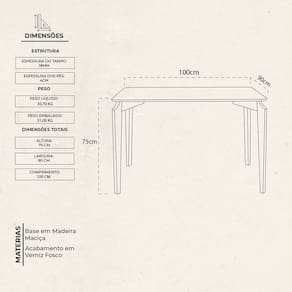 Acabamento: Verniz fosco Acabamento: Verniz Acabamento da Base: Verniz Acabamento do Tampo: Verniz Ambiente Principal: Sala de Jantar Atóxico: Sim codigo_ean: 7900288197306 Complexidade da Montagem: Baixa: pode ser montado por uma pessoa sozinha Cor: Mel Cor do Produto: Mel Design da Base: 4 Pés Dobrável: Não Escala de Brilho: Fosco Espessura do Tampo: 18 mm Extensível: Não Itens Inclusos: 1 Mesa e Kit Ferragens Linha ou Coleção: Aura Manual de Montagem e Instalação: https://product-hub-prd.madeiramadeira.com.br/212236855/documents/a82c105c-8427-4937-aa89-112b95e70ffe3078864491417527837878595.pdf Marca: Árvore de Minas Material da Base: Madeira Maciça Material do Tampo: MDF Material Principal: Madeira Maciça Medida da Base (A x L x P): 75 x 90 x 100 Medida da Mesa (A x L x P): 75 x 90 x 120 Medida do Tampo (L x C x E): 90 x 100 x 1,8 Necessita Montagem: Sim Origem do Produto: Nacional Peso: 30,7 kg Possui Portas: Não Possui prateleira: Não Possui Rodízio: Não Possui Suporte Giratório: Não Possui Vidro: Não Recomendações de Uso, Manutenção e Limpeza: Utilizar pano umido, não utilizar liquidos abrasivos Sistema de Montagem: Fixação de Parafusos Suporta Até (kg): 120 kg Tipo de Madeira Maciça: Tauari Tipo de Madeira Maciça da Base: Tauari