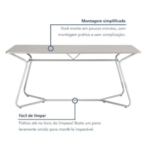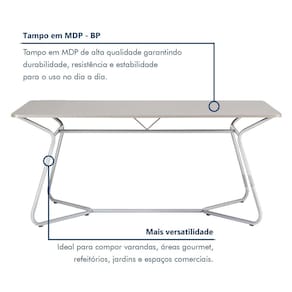 A mesa para jantar é segura? Claro, produzida com os melhores materiais. Acabamento: Pintura Acabamento da Base: Pintura Acabamento do Tampo: Pintura Ambiente Principal: Sala de Jantar codigo_ean: 7900288185037 Complexidade da Montagem: Baixa: pode ser montado por uma pessoa sozinha Cor: Cromada/Branco Cor do Produto: Cromada/Branco Design da Base: Trenó Dobrável: Não Escala de Brilho: Semi-Brilho Espessura do Tampo: 18 mm Extensível: Não Itens Inclusos: 1 Mesa, Kit Ferragens e Manual de Montagem Linha ou Coleção: Vareta Manual de Montagem e Instalação: https://product-hub-prd.madeiramadeira.com.br/359052136/documents/3c81968a-4316-4c0f-bd52-834662236206303548373217513749120716.pdf Marca: Prima Design Material da Base: Aço Material do Tampo: MDP Material Principal: Aço Medida da Base (A x L x P): 72,5x180x90 Medida da Mesa (A x L x P): 75,5x180x90 Medida do Tampo (L x C x E): 180x90x18 Necessita Montagem: Sim Origem do Produto: Nacional Peso: 27 kg Possui Portas: Não Possui Rodízio: Não Possui Vidro: Não Recomendações de Uso, Manutenção e Limpeza: A estrutura deve ser limpa utilizando pano seco de algodão ou flanela. Se necessário, utilize panoumedecido apenas com água, secando o móvel em seguida. Não utilize solvente, álcool, acetona, lustra móveis, produtos abrasivos e outros produtos que contenham soda e ou ácidos para limpar e tirar manchas dos móveis. Não expor os móveis à luz solar e ambientes com umidade relativa elevada. Manter a estrutura metálica limpa, utilizando pano seco ou cera a base de silicone. Sistema de Montagem: Parafusos Suporta Até (kg): 40 kg Marca: Não Informado