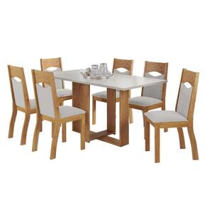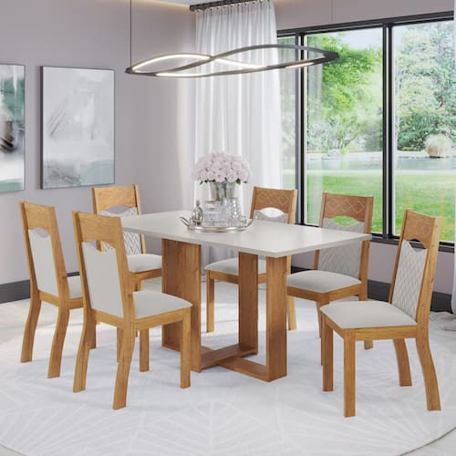 - Vidro Temperado: Não - Possui Vidro: Não - Observação: Objetos decorativos que aparecem nas imagens, não acompanham o produto. A capacidade de carga considera que o peso está distribuído igualmente pela peça. As cores das imagens podem variar de acordo com as configurações do seu monitor e/ou da iluminação do ambiente onde o produto está inserido. As imagens indicam uma sugestão - Pode Ser Montado Invertido?: Não - Possui Borda de PVC nas Bordas?: Não - Pés com regulagem de altura?: Não - Possui Pés?: Sim - Possui Sapatas?: Sim - Possui Rodízios?: Não - Possui Tampo?: Sim - Cadeira Estofada: Sim - Possui Puxadores?: Não - Acompanha Cadeiras: Sim - Possui Prateleiras?: Não - Possui Espelho?: Não - Possui Portas?: Não - Possui Gavetas?: Não - Categoria: Mesa de Jantar 6 Lugares - Peso Suportado no Tampo: 50 kg - Peso Suportado: 90 kg - Revestimento/Acabamento: Pintura UV - Quantidade de Pés: 24 - Garantia (dias): 90 Dias - Recomendação de Manutenção: Utilizar pano levemente umedecido, seguido de pano seco. Não utilizar quaisquer produtos abrasivos. - Indicação de Uso: Sala de Jantar - Acompanha: KIT FERRAGEM E MANUAL DE MONTAGEM - Sistema de Montagem: Parafusos, cavilhas, cola e minifix. - Grau de Dificuldade de Montagem: Médio - Necessita de Montagem: Sim - Como os Móveis Chegarão em Minha Casa?: Desmontado em caixas, acompanhado de todas as peças, ferragens e manuais para montagem. - Quantidade de Sapatas: 28 - Espessura do Tampo (mm): 25 mm - Material do Tampo: MDP - Escala de Brilho: Semi-Brilho - Tecido da Cadeira: VELUDO - Material do Encosto: Mdp e Espuma - Medidas da Cadeira ( A x L x P ): A:98,5 X L: 38 X P:50,5 - Material do Assento: Mdp e Espuma - Altura do Chão até o Assento (cm): 49 - Quantidade de cadeiras por conjunto: 6 - Densidade do Encosto: D-12 - Densidade do Assento: D-16 - Quantidade de Lugares: 6 Lugares - Formato da Mesa: Retangular - Material do Tampo: MDP - Espessura da Estrutura: 25 mm - Material da Estrutura: Mdp e Mdf