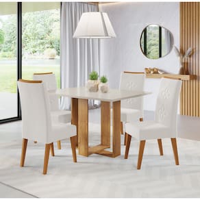 - Vidro Temperado: Não - Possui Vidro: Não - Revestimento/Acabamento: Pintura UV - Pode Ser Montado Invertido?: Não - Necessita de Montagem: Sim - Possui Borda de PVC nas Bordas?: Não - Pés com regulagem de altura?: Não - Possui Pés?: Sim - Possui Sapatas?: Sim - Possui Rodízios?: Não - Possui Tampo?: Sim - Cadeira Estofada: Sim - Material do Encosto: Mdf, Espuma, Madeira - Medidas da Cadeira ( A x L x P ): A:98,5XL:41XP:61 cm - Possui Puxadores?: Não - Material do Assento: Espuma e Madeira - Material do Tampo: MDP - Categoria: Mesa de Jantar 4 Lugares - Peso Suportado no Tampo: 50 kg - Peso Suportado: 90 kg - Quantidade de Pés: 16 - Garantia (dias): 90 Dias - Recomendação de Manutenção: Utilizar pano levemente umedecido, seguido de pano seco. Não utilizar quaisquer produtos abrasivos. - Observação: Objetos decorativos que aparecem nas imagens, não acompanham o produto. A capacidade de carga considera que o peso está distribuído igualmente pela peça. As cores das imagens podem variar de acordo com as configurações do seu monitor e/ou da iluminação do ambiente onde o produto está inserido. As imagens indicam uma sugestão - Indicação de Uso: Sala de Jantar - Acompanha: KIT FERRAGENS E MANUAL DE MONTAGEM - Sistema de Montagem: Parafusos, cavilhas, cola e minifix. - Grau de Dificuldade de Montagem: Médio - Como os Móveis Chegarão em Minha Casa?: Desmontado em caixas, acompanhado de todas as peças, ferragens e manuais para montagem. - Quantidade de Sapatas: 20 - Espessura do Tampo (mm): 25 mm - Material do Tampo: MDP - Escala de Brilho: Semi-Brilho - Tecido da Cadeira: VELUDO - Altura do Chão até o Assento (cm): 485 - Quantidade de cadeiras por conjunto: 4 - Densidade do Encosto: D-20 - Densidade do Assento: D-20 - Acompanha Cadeiras: Sim - Possui Prateleiras?: Não - Quantidade de Lugares: 4 Lugares - Formato da Mesa: Retangular - Possui Espelho?: Não - Possui Portas?: Não - Possui Gavetas?: Não - Espessura da Estrutura: 25 mm - Material da Estrutura: Mdp, Mdf, Eucalipto