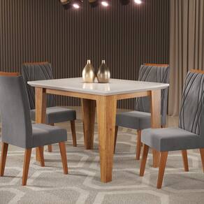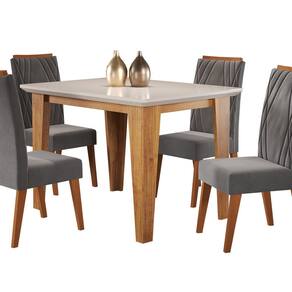 Mesa de Jantar Retangular Divine com Vidro 1,20x90 e 4 Cadeiras Vegas em Madeira Maciça Mel/off White/Grafite - Cinza